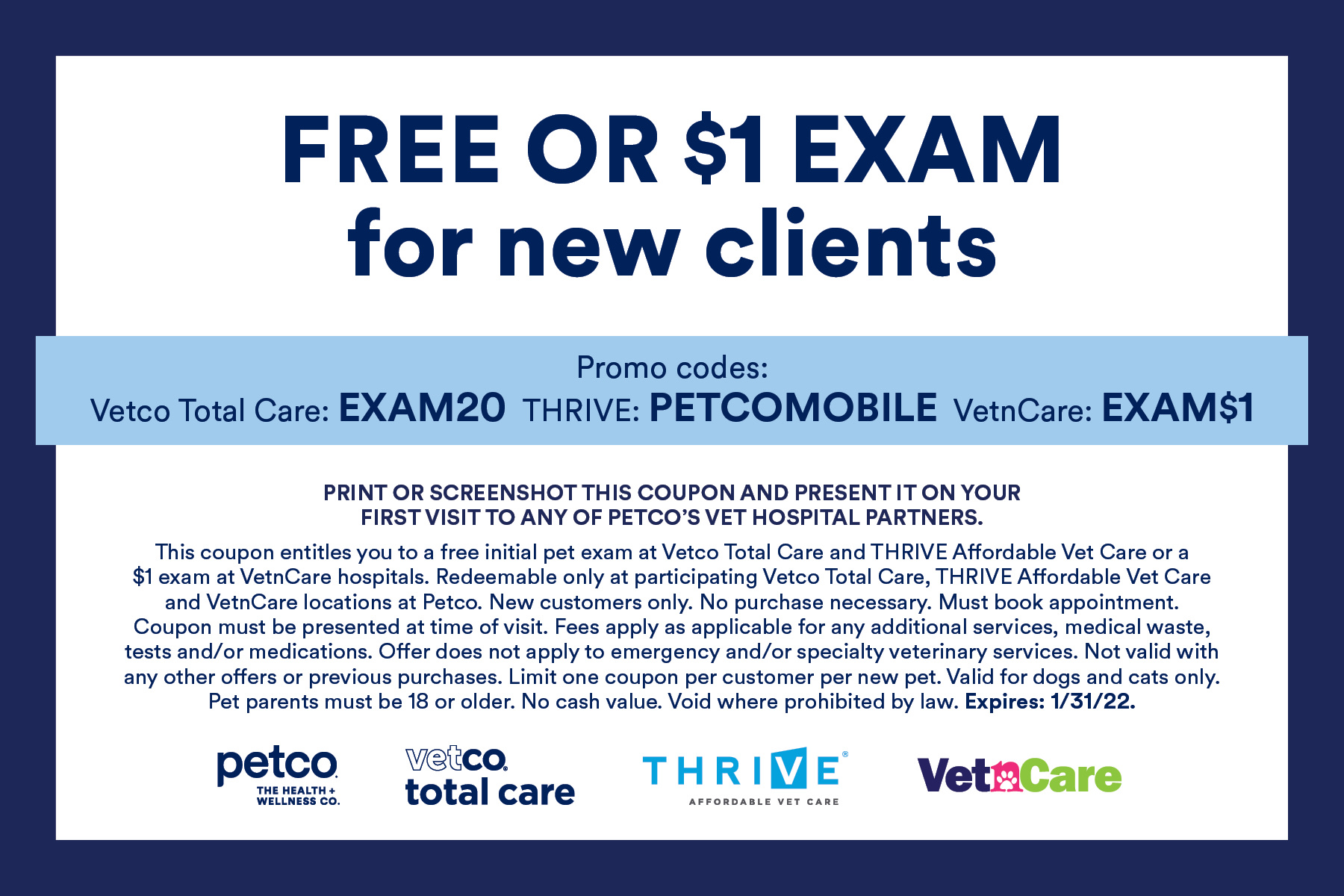 Get a Free Vetco Total Care Pet Exam with this Coupon Code. For full Rewards Terms and. T o make an appointment click on an animals photo and follow the link in the profile.